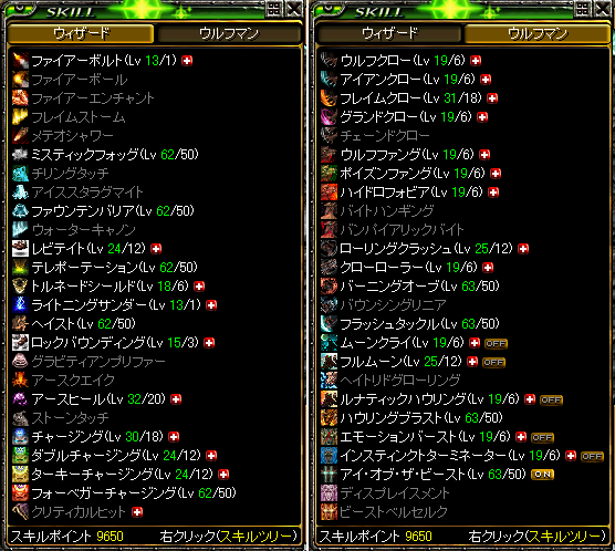 キラッ☆ ぱんぱかぱーーーん!! ドン! 転生しましたぁ!!! 時森卒業いたしましたので、転生しちゃいました!!! 装備はもう異次元品しか欲しいのほとんどないでしょ、ってことは 強くなるにはステあげるしかないじゃんね▽・д・▽ はい、転生! 転生してみて。 適正狩り場行ったら、転生前と変わらずw 昨日はスワンプで廃上げしましたw 3レベ半! がんばったっ!!! んなことはどうでもよくて。 転生前は神秘のラットでクエしつつカケラ出してたのですが、わおーんが15000前後、毛玉が10000弱。 スワンプにて、変わらず。 むしろちょっとダメ上回っている。 転生して、神秘ラットに行ってみた。 3~4000下がっている。 まぁ知識500下がってるからねぇ▽=ω=▽ んでんで、転生後のステスキルはー。 ↓ 力→無振り 知識→残り全部 敏捷→-24。要求分。 知恵→無振り。 健康→-50(調整中) カリスマ→-150(調整中) 運→無振り ※わんこ状態でのステです。 ※すみません、REDSTONE所持してましたwwwww なんか10多いじゃねぇよってーーーの 転生後のステ、全部マイナス10です▽=ω=▽ マイナスした分は全部知識へ。 健康とカリスマは、WIZ⇔わんこなっても健康がなるべく同じになるように調節しつつ、狩りで死なない程度にしつつ、この数値で行けそうだったら健康とカリから引いた合計200ステを全部知識に振る。 そしたら知識2385だじぇ!! 転生前とレベル、ステ比べたらなかなかであろう。 とりあえずスワンプは今の健康で余裕である。 G戦が休止中だからいいけど、G戦あったらここは詰められないなぁ。 スキルはとりあえずコレ。 ずっと持ってたけど使ってなかったスキルとかは排除。 余ってるSPは迷い中。 トルネードシールドとろうかなぁと思ってるくらい。 うん。こんな感じ!!! レベあげがんばるぞう、おう。 あ。今このブログ書いた直後にトルネードシールドマスタしてきた▽・д・▽ ダメ1000~2000くらい。 まぁないよかいいかと思いまする・・・・。うん。 余りSP5843。 PR